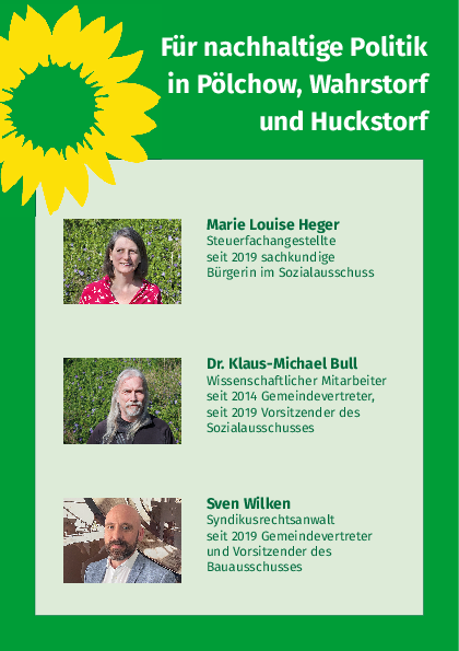 In der Wahlperiode 2019 – 2024 sind die Grünen mit Klaus-Michael Bull und Sven Wilken in der Gemeindevertretung als Fraktion präsent. Beide haben als Vorsitzende des Bauausschusses und des Sozialausschusses die Politik in der Gemeinde federführend mitgeprägt. Marie Louise Heger ist als sachkundige Bürgerin Mitglied im Sozialausschuss.
