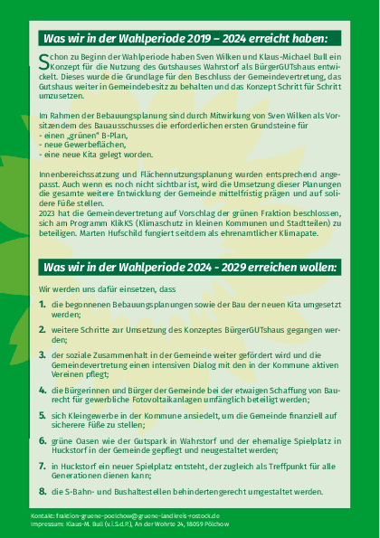Ich freue mich darauf, mit Ihnen ins Gespräch zu kommen und Ihre Anliegen und Ideen kennenzulernen. Lassen Sie uns gemeinsam für eine lebendige, nachhaltige und gerechte Zukunft im Landkreis Rostock einstehen.