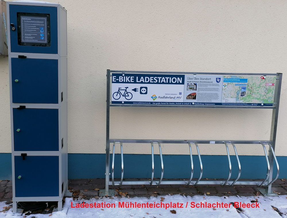 Nun verfügt Schwaan insgesamt über drei Ladestationen für E-Bikes: die „alte“, etwas versteckt gelegene und nur mittels vorher von der Kunstmühle zu holendem Schlüssel nutzbare und daher wenig genutzte hinter der Kunstmühle und die beiden neuen am Mühlenteichplatz beim Fleischereigeschäft Bleeck und am Markt nahe der Bäckerei Schröder.