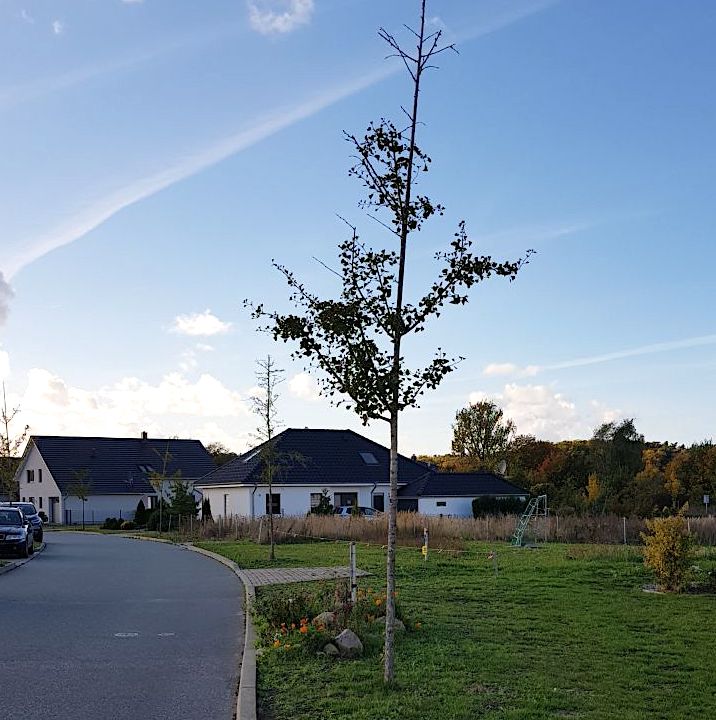 Zu wenig Beachtung finden auch die Düngung und eine regelmäßige Wässerung während der klimatisch bedingt zunehmenden Trockenperioden: In der nördlichen Hermannstraße kann man den Bäumen beim Sterben zusehen. Alle Kronen haben Trocken- und Hungerschäden. Ebenso ist es im Wohngebiet am Rieden (B-Plan 12). Die Hälfte der neuen Jungbäume am Weg zwischen Poststraße und Baltic-Park (Titelbild) sind völlig vernachlässigt, teilweise vertrocknet. Es scheint keine Bewässerungspläne zu geben, die sicherstellen, dass der Bedarf von bis zu 100 Liter Wasser pro Woche und Baum gedeckt wird. Erfreulicherweise wurden für die jüngsten Baum-Pflanzungen an der Reriker Straße Bewässerungssäcke beschafft, das Programm für die übrigen städtischen Bäume ist jedoch noch stark ausbaufähig.