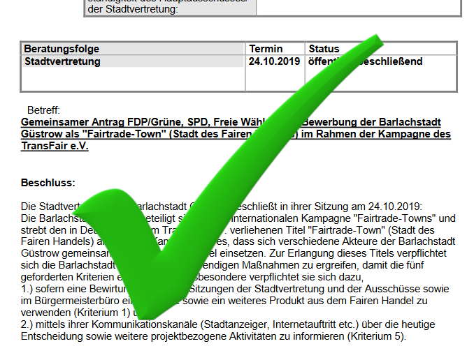 Die Stadtvertretung der Barlachstadt Güstrow hat in ihrer Sitzung am 24. Oktober beschlossen, dass sie künftig den Fairen Handel fördern und sich offiziell um den Titel „FairTrade-Town“ bewerben möchte.